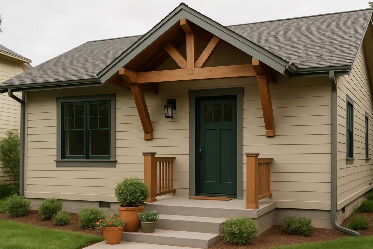 A cozy house with accessible beige exterior and forest green accents, surrounded by greenery.
