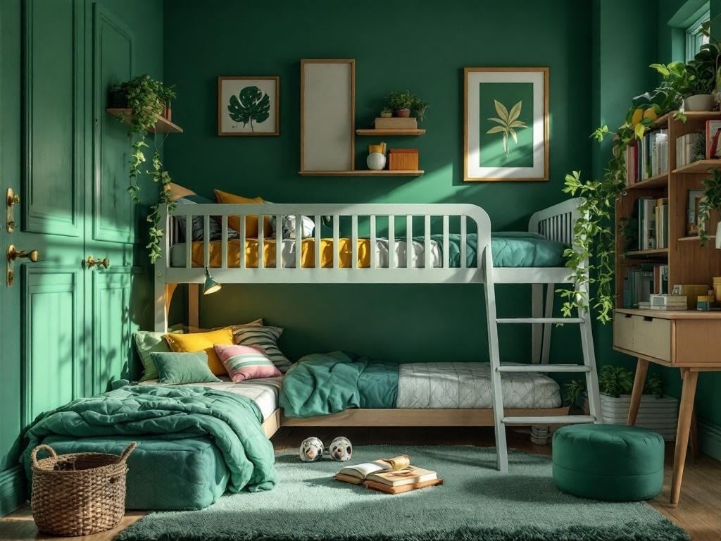 An emerald green accent wall can completely change the vibe of your dorm room. This rich color adds depth and character, making the space feel more inviting and stylish.