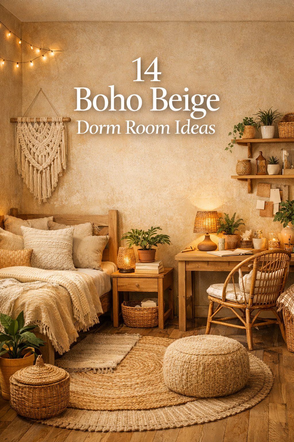 Woven baskets are a fantastic way to add both style and functionality to your dorm room. They come in various sizes and textures, making them perfect for organizing your space. In the image, you can see a cozy corner filled with these baskets, which blend seamlessly into the boho beige theme.