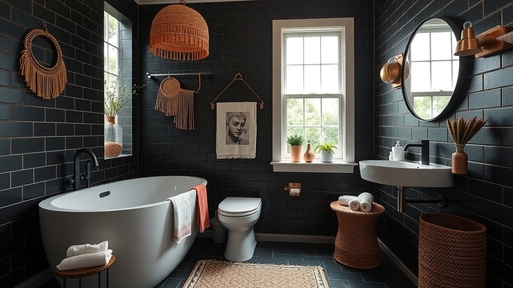 A freestanding bathtub can be the centerpiece of a boho black bathroom. This style combines elegance with a relaxed vibe, making it perfect for unwinding after a long day.