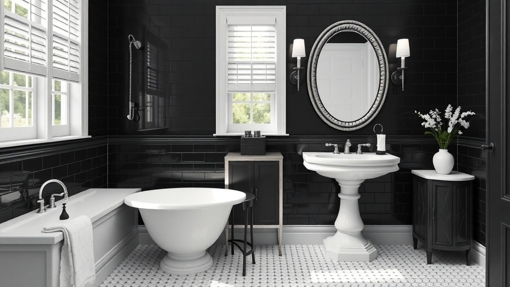 Notice how the black faucet and accessories bring a bold statement to the space. They draw the eye and add depth, making the bathroom feel both chic and inviting. This contrast is not just functional; it creates a striking focal point that can inspire your own bathroom design.