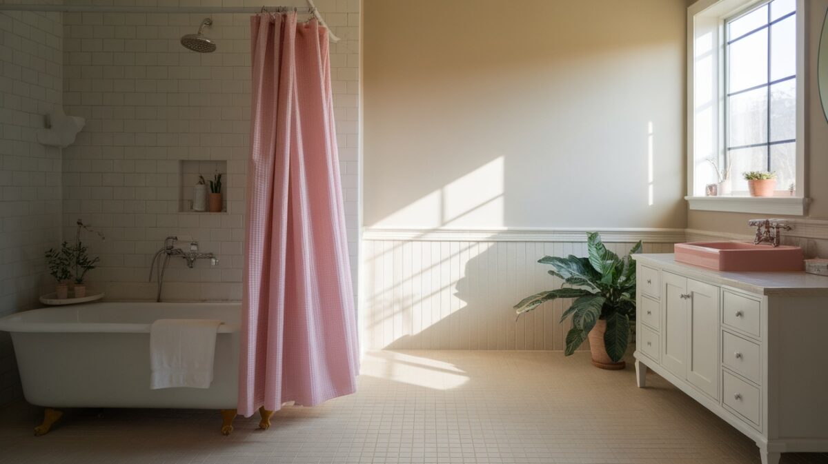 Blush pink shower curtains and linens can transform your bathroom into a cozy retreat. The soft, warm hue adds a touch of elegance while keeping the space inviting. In the image, you can see a beautiful blush pink shower curtain that drapes gracefully, creating a serene atmosphere.