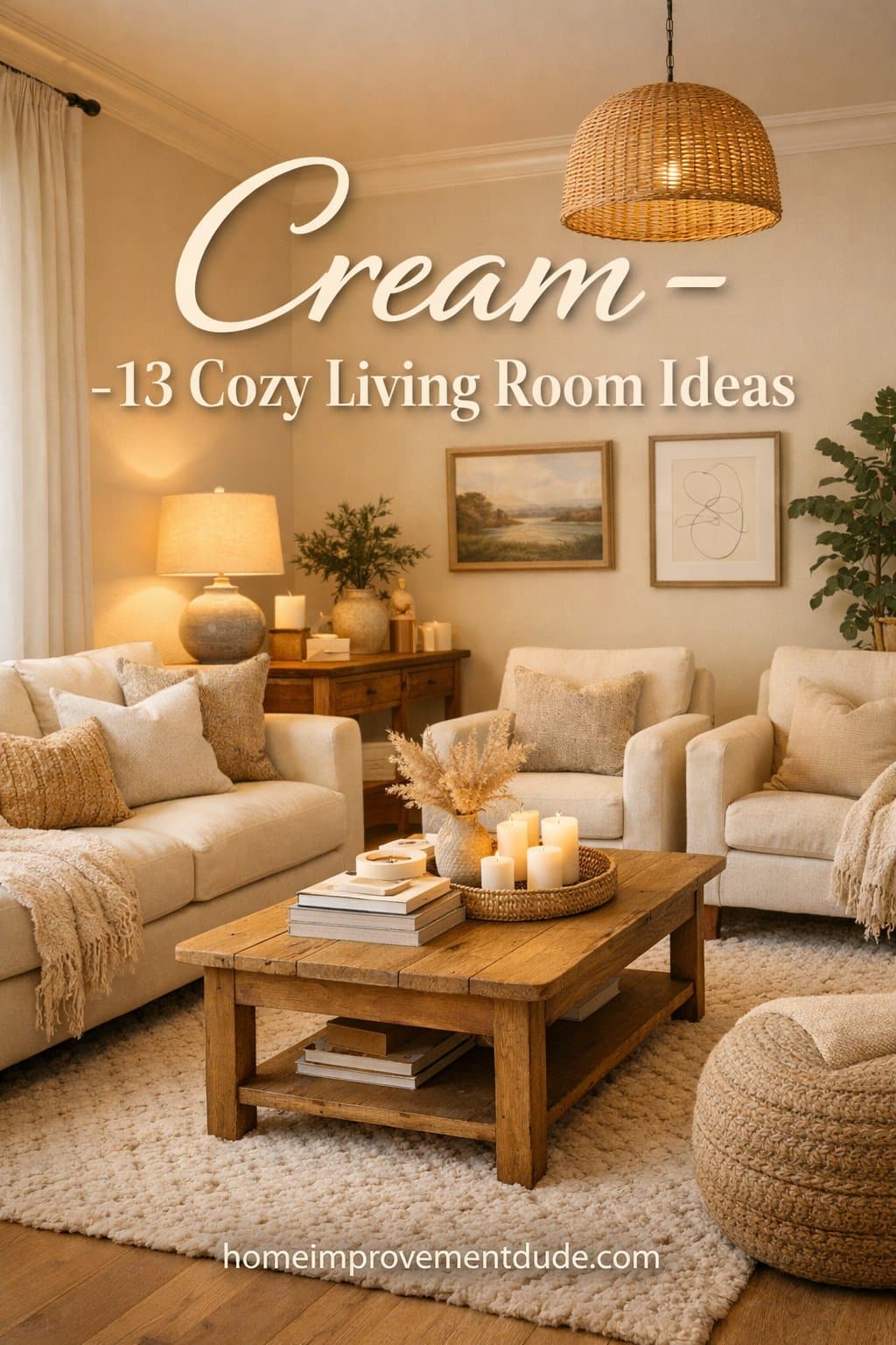 Creating a cozy cream living room starts with the right lighting. The image showcases a beautifully lit space that feels inviting and warm. Soft, diffused light from various sources sets the tone for relaxation.