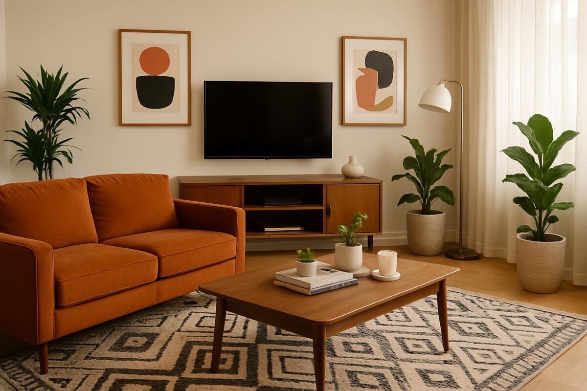 A rust sofa grounds the room with a tone that blends the strength of red, the stability of brown, and the energy of orange. This balance makes it versatile, pairing well with both neutral walls and bolder accents.