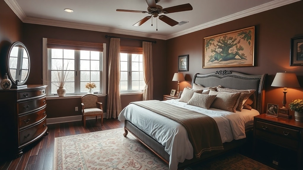 Warm chocolate accent walls can completely change the feel of a bedroom. This rich, deep brown color brings a cozy vibe that invites relaxation. In the image, the chocolate wall beautifully contrasts with the lighter bedding and decor, creating a balanced look.