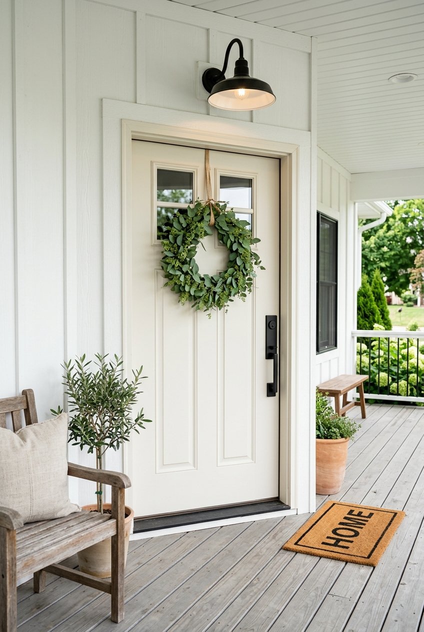 Try a natural wood bench, a jute rug, or planters in aged terracotta. Greenery such as boxwoods or olive trees adds depth against the light door color.