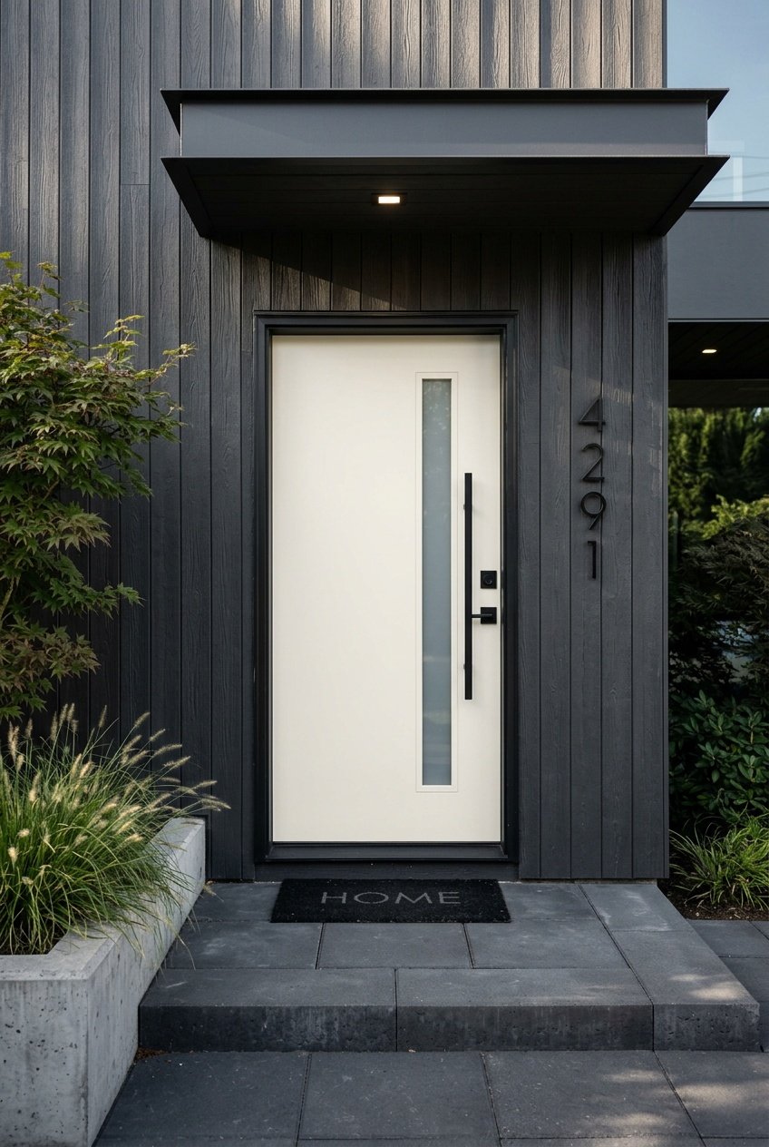 - House numbers: Minimal metal numbers mounted directly to the siding