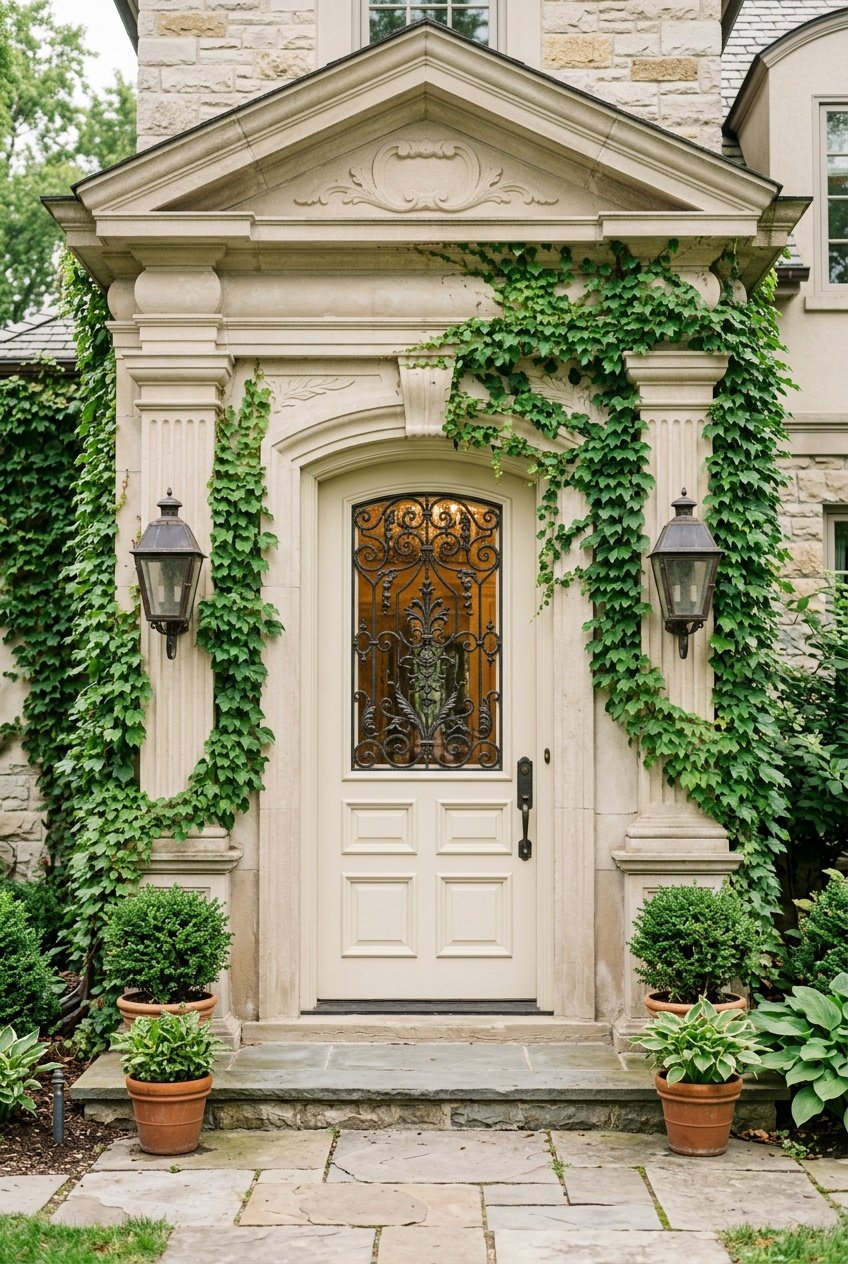 You can also incorporate arched doorways or transom windows to echo European architecture. Symmetry matters here, so balance planters or lanterns on each side of the door.