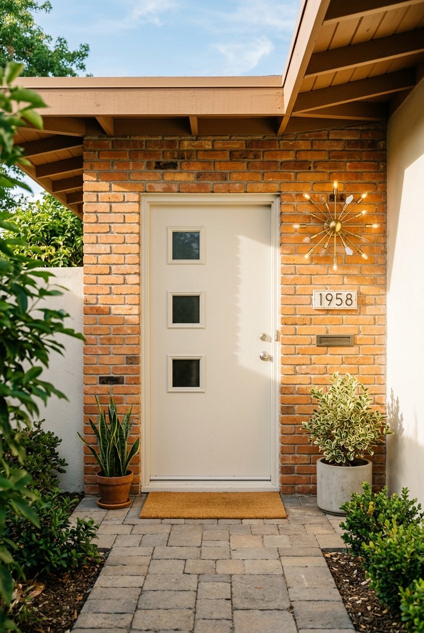 Keep landscaping structured and simple. Low-profile shrubs, gravel beds, and symmetrical planters reinforce the mid-century aesthetic while keeping your entry clean and inviting.
