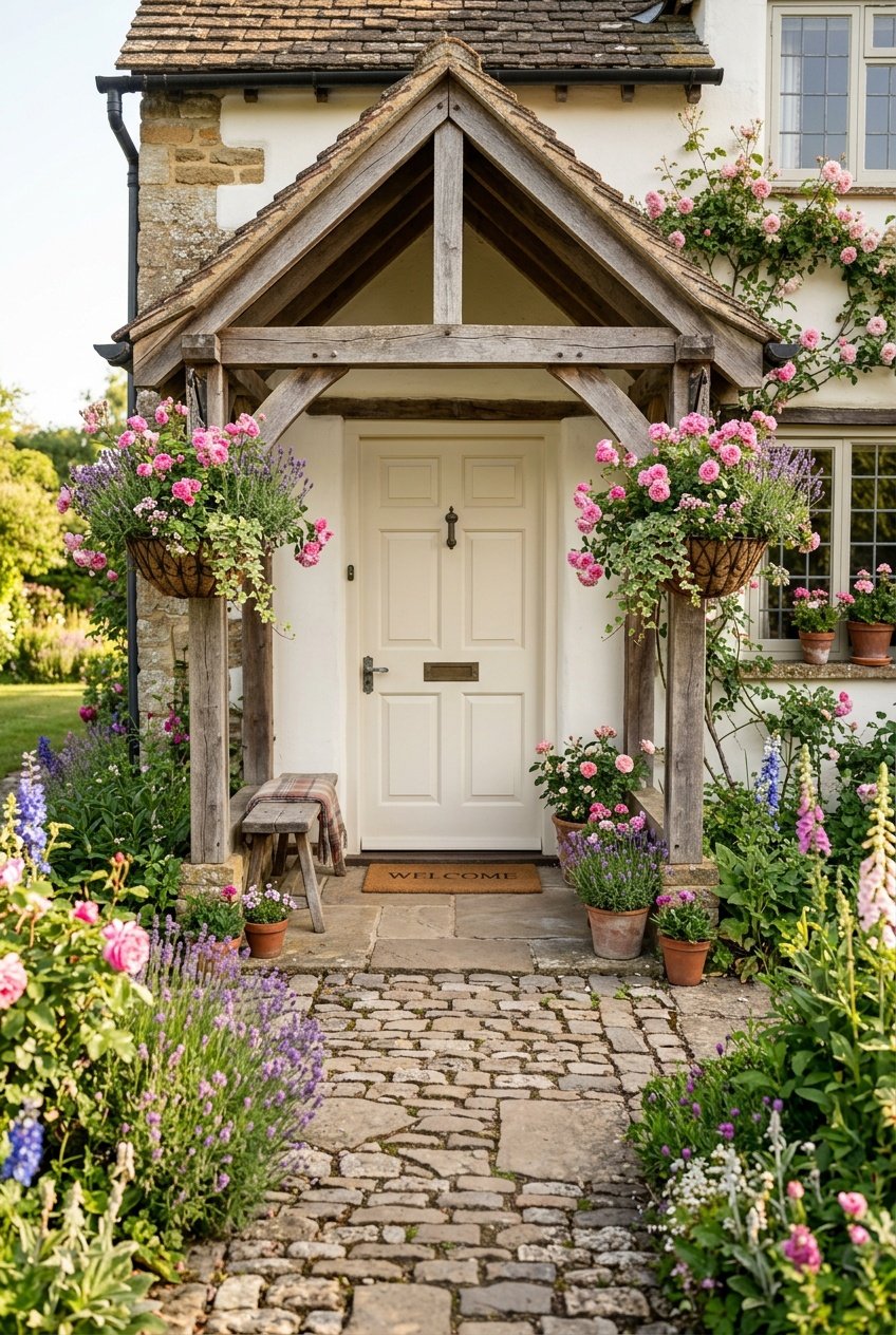 Frame the entrance with climbing roses, lavender, or maybe some neatly trimmed boxwoods. A stone or brick pathway really brings in that English garden vibe and softens the walk up to the door.
