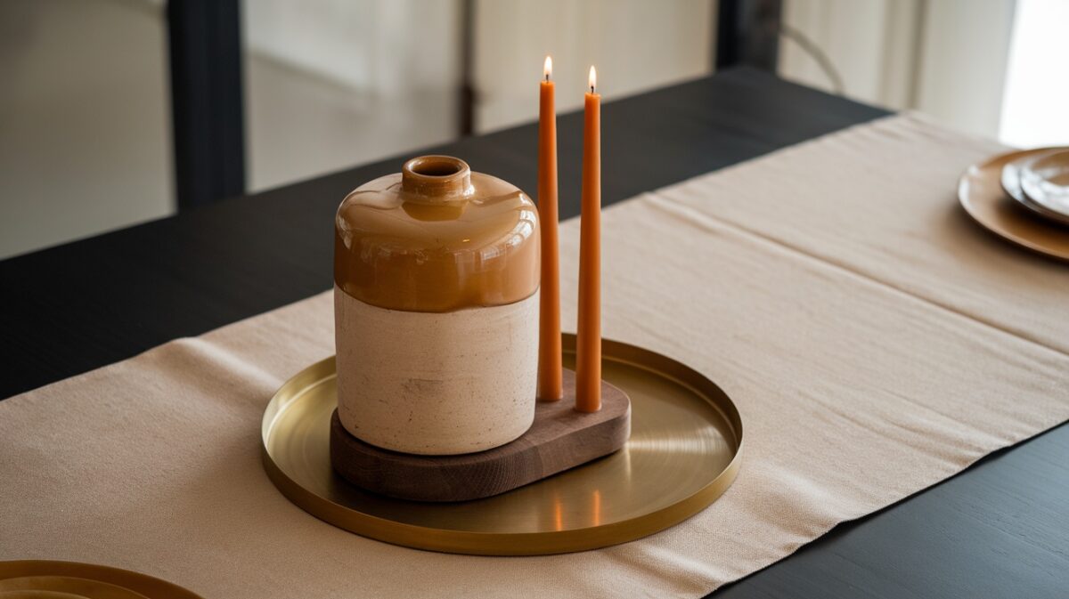 Creating a cozy dining space can be as simple as choosing the right centerpiece. A collection of caramel-hued vases and candles can bring warmth and style to your table. The image showcases a lovely arrangement of various ceramic vases and candles, all in shades of caramel, sitting on a neutral tray.