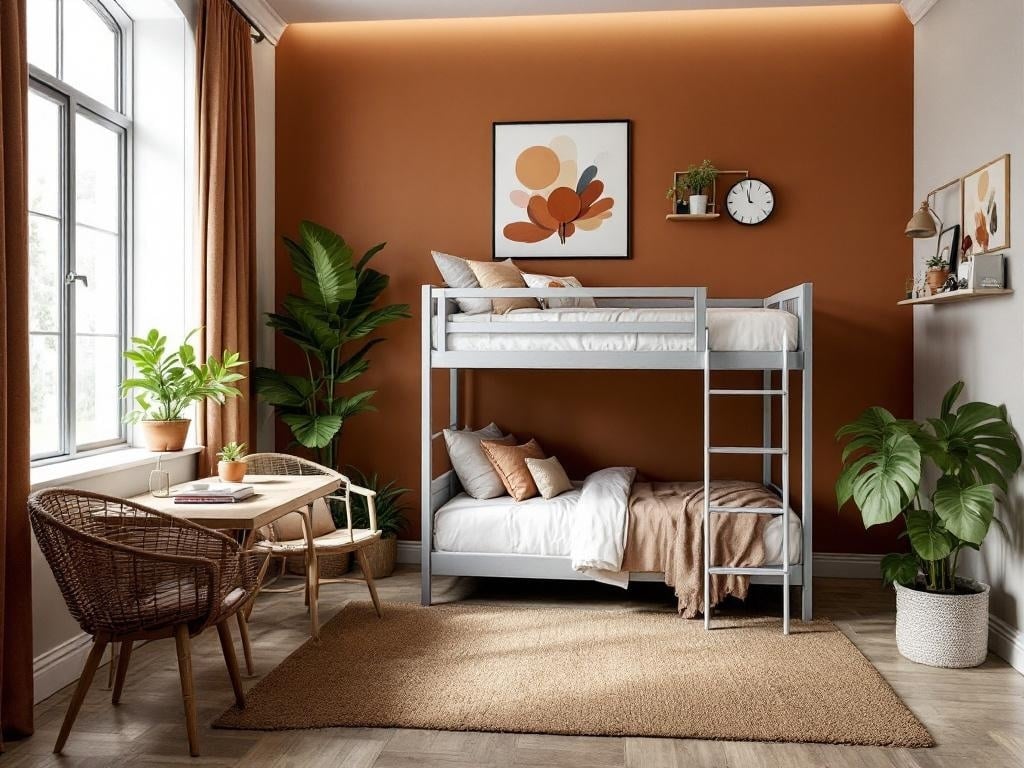 An accent wall can completely change the vibe of a dorm room. In this cozy setup, the burnt sienna paint adds warmth and character. The rich hue contrasts beautifully with the lighter tones of the other walls, creating a balanced look.