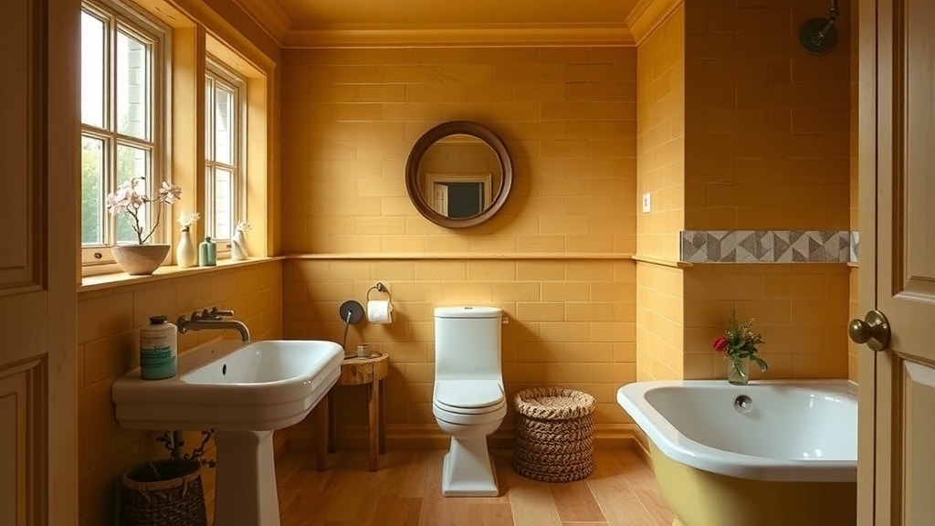 Accessorizing a moody ochre yellow bathroom can be a fun way to bring in some personality. The warm yellow walls create a cheerful backdrop, making it easy to choose colors that pop. Think about using earthy tones like terracotta or soft greens to balance the brightness of the yellow.