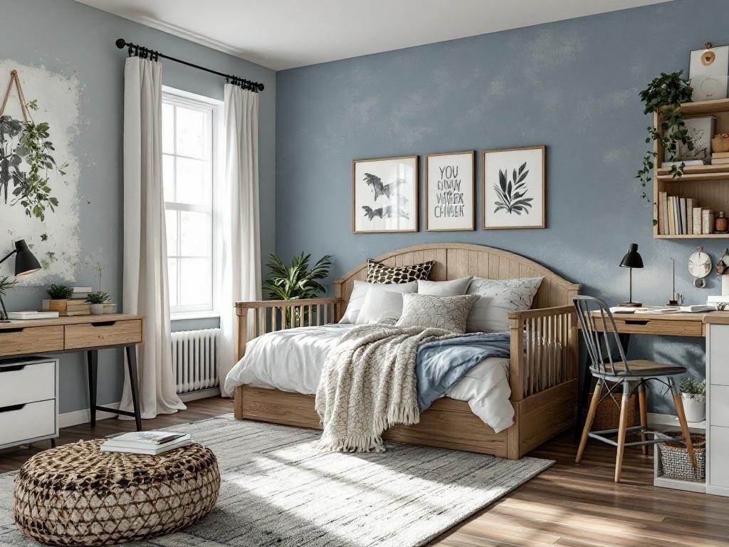 These pillows not only serve as comfortable back support while studying or lounging but also act as a stylish accent. The soft hues of blue blend beautifully with the neutral bedding, creating a serene atmosphere. This color scheme is perfect for a rustic modern vibe.