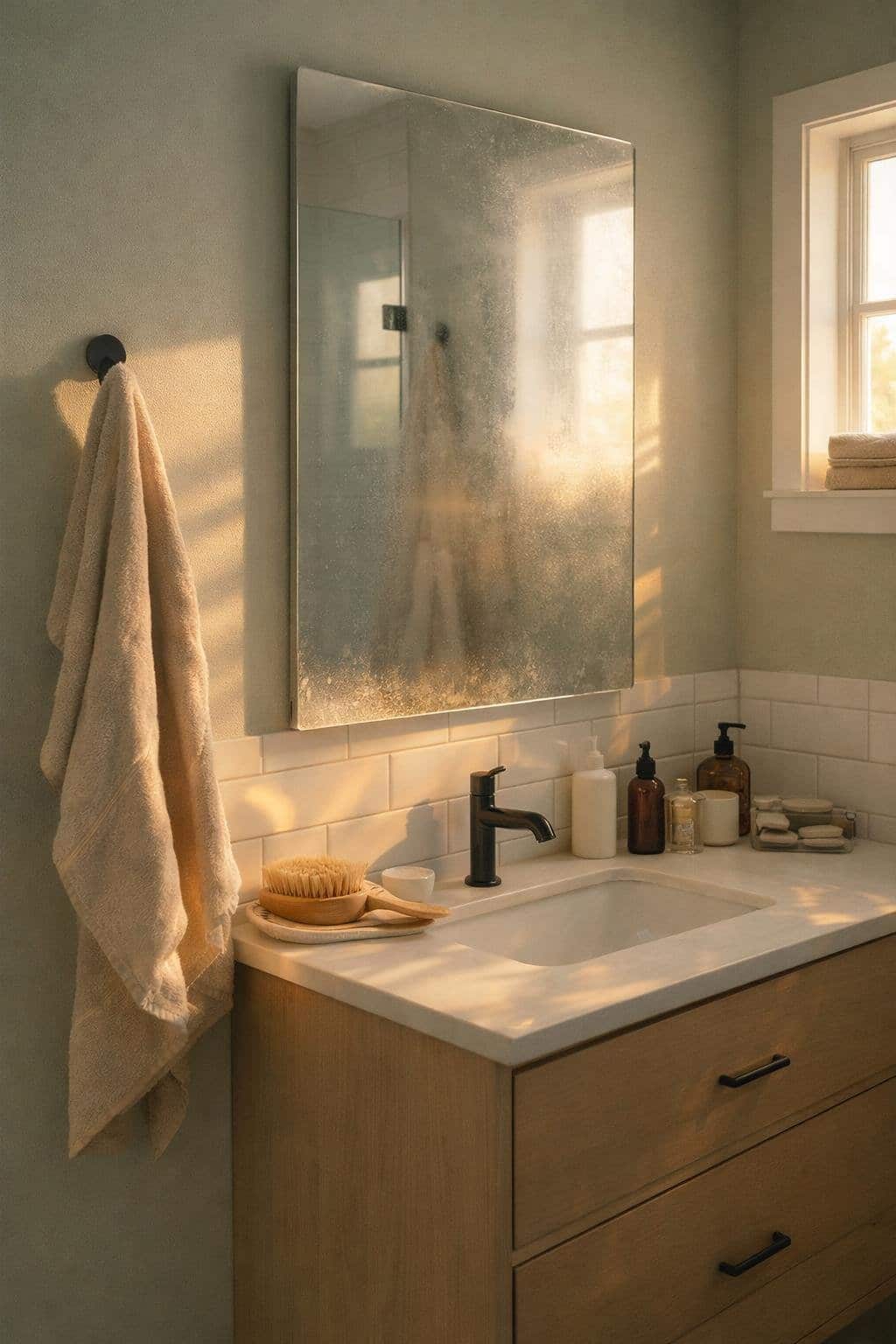 A darker vanity, lightly veined stone, or smoked glass accessories add depth without overpowering the walls.