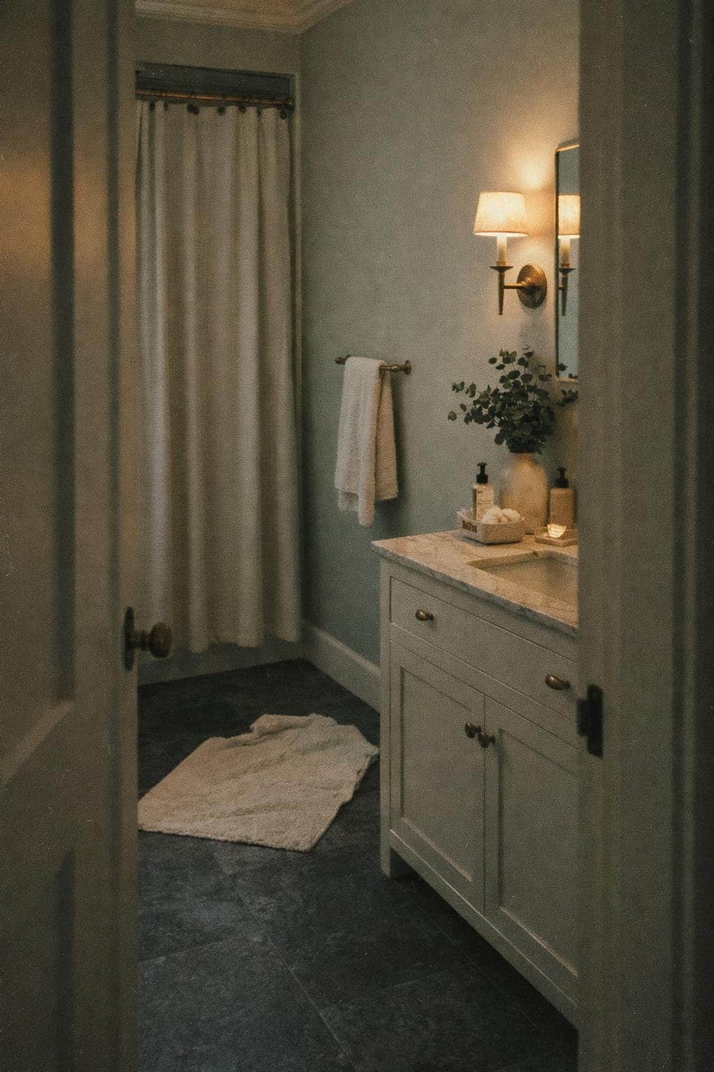 You see more of its gray and green undertones at night, creating a calm, enclosed feel without making the bathroom look dark.