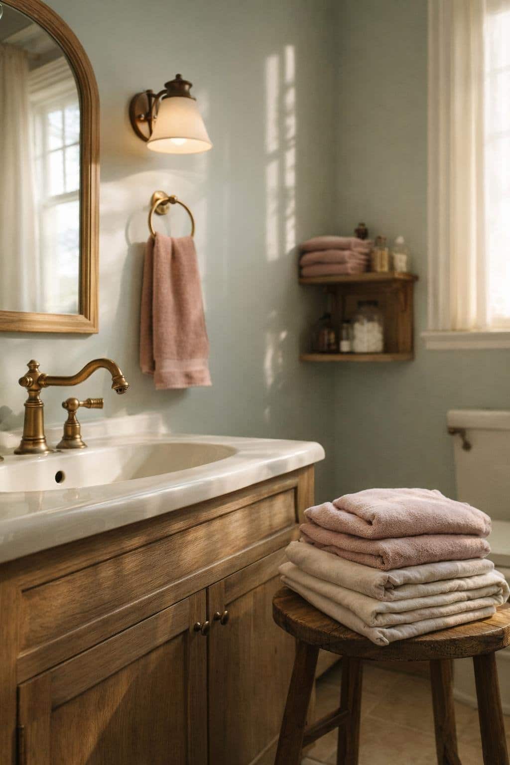 A framed mirror, glass jars, or a small stool adds function and personality without distraction.
