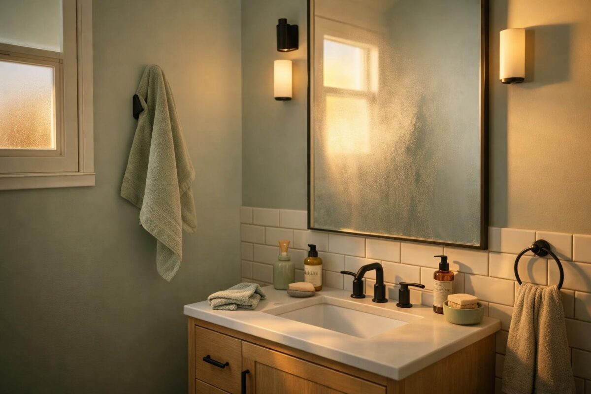 - Brushed brass or warm chrome fixtures to reflect light softly
