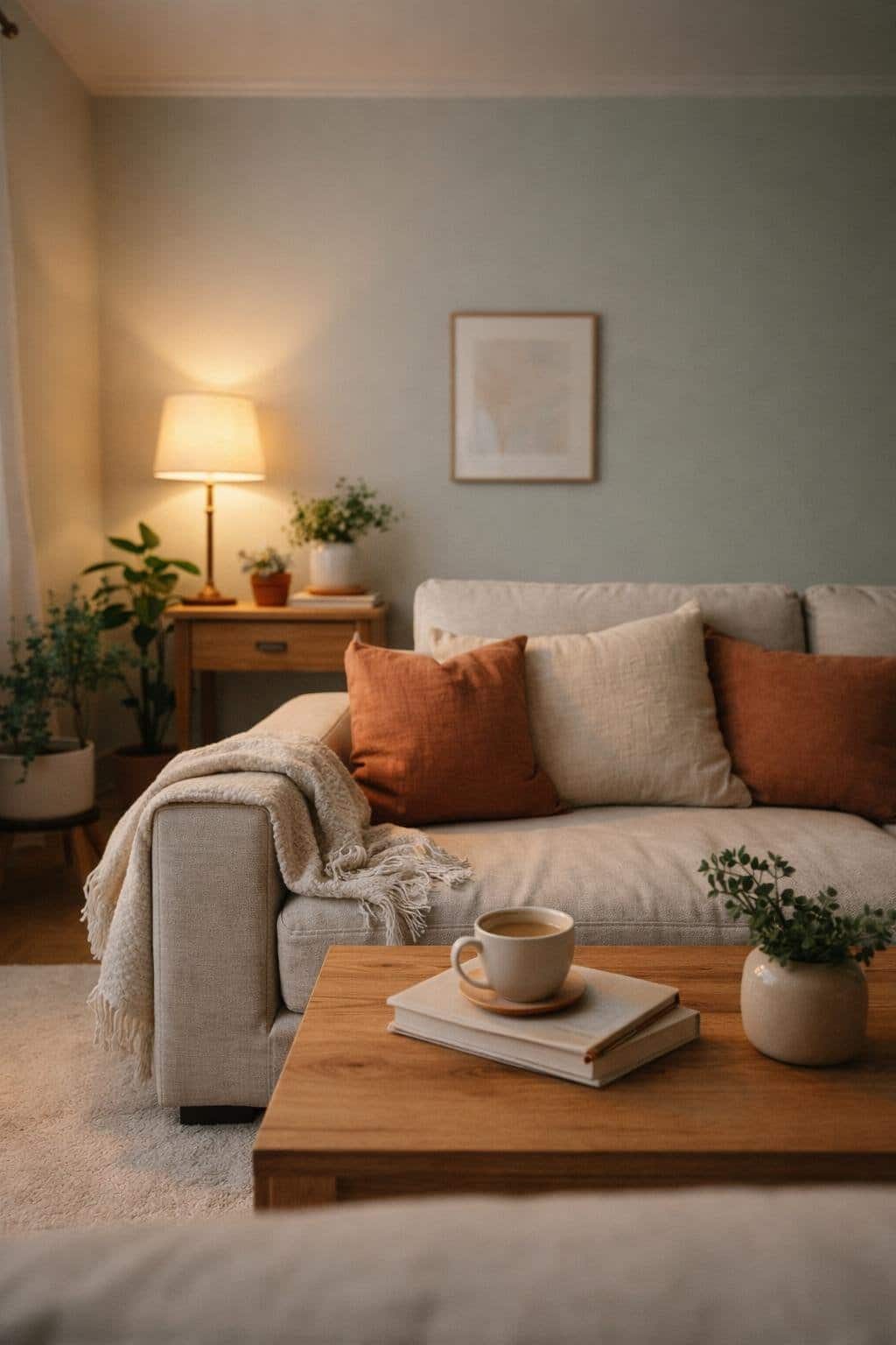 You create a calm, evening-ready living room when you pair Sea Salt by Sherwin‑Williams with soft textures and warm lighting.