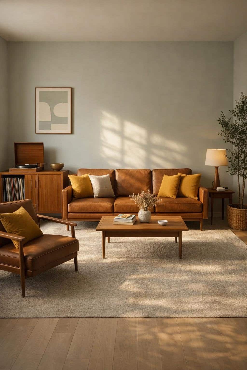 Leather seating, woven textiles, and low‑profile furniture reinforce the era’s functional design while keeping the palette relaxed.