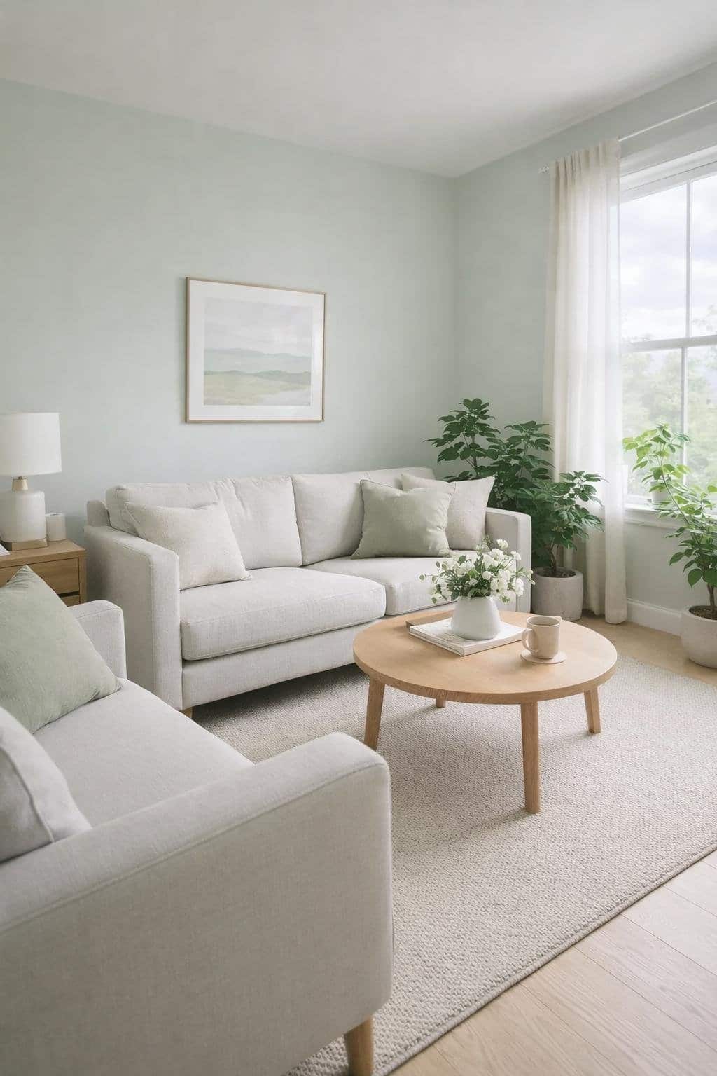 You keep the room grounded by limiting contrast. Sea Salt pairs best with warm neutrals and subtle patterns, not sharp blacks or bright whites.