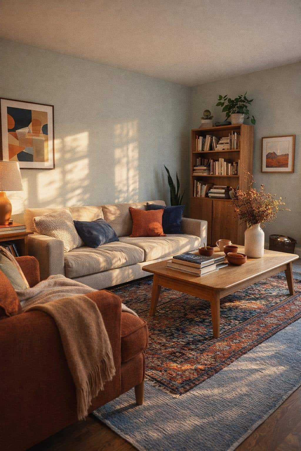 You’ll see how this color supports cozy evenings, low‑light drama, mid‑century warmth, soft daytime calm, and layered eclectic spaces.