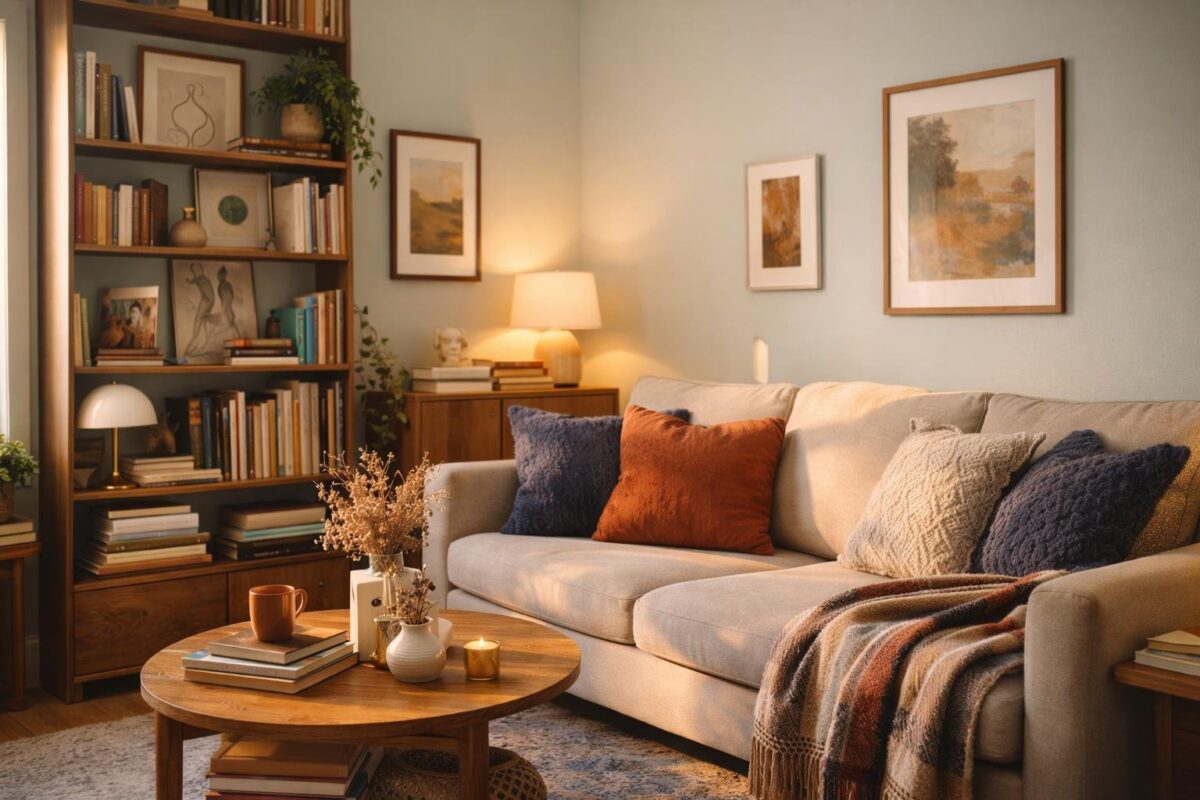 You strengthen the cozy effect with layered materials. Upholstered seating, woven throws, and low‑pile rugs add comfort while keeping the room visually simple.