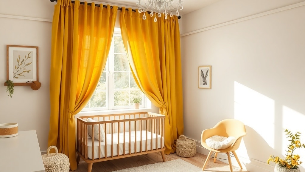 Pairing these window treatments with light-colored walls and a simple crib enhances the nursery’s peaceful vibe. The soft textures of the curtains and the plush rug on the floor create a welcoming environment. This setup is ideal for quiet moments, whether it’s reading a bedtime story or enjoying a peaceful nap.