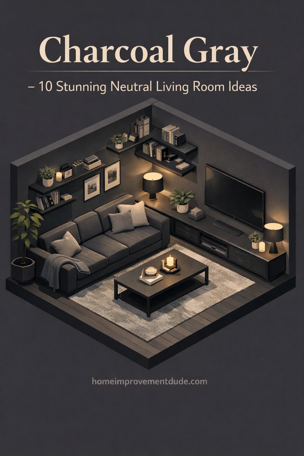 Adding a touch of greenery with the plant in the corner brings life into the room. This combination of elements creates a cozy yet elegant atmosphere, perfect for relaxing or entertaining guests. Charcoal gray is not just a color; it’s a statement that adds depth and character to any living room.