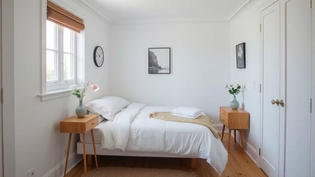 White wall art can really brighten up a tiny bedroom. In this space, the art pieces are simple yet striking. They create a clean and modern look that feels inviting.