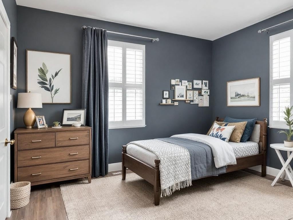 To complement slate blue, consider using soft neutrals like beige or cream. The bedding in the image features a light beige throw, adding warmth and contrast. This combination makes the room feel cozy and inviting.
