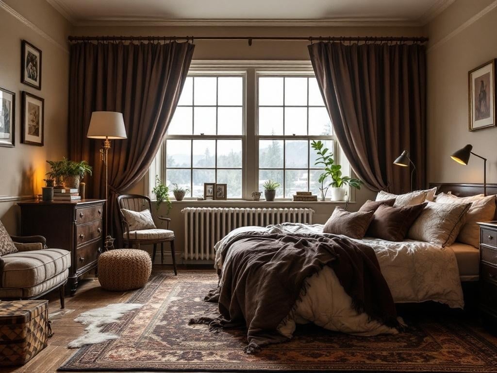 Positioning a vintage mirror above your dresser or bed can create an illusion of more space. It draws the eye and makes the room feel larger and more inviting. The warm tones of the mirror’s frame complement the chocolate brown theme beautifully.