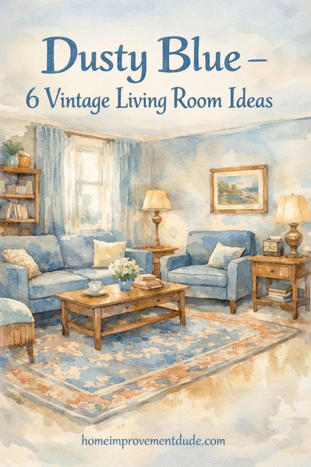 Textiles like throw pillows and rugs can also contribute to the room’s charm. The mix of patterns and textures seen here adds interest without overwhelming the space. A vintage-inspired rug anchors the seating area, tying together the dusty blue tones with earthy accents.